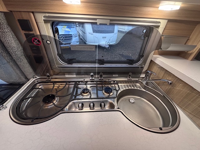 KEUKEN met 3-pits kookstel, SPOELBAK, DOMETIC KOELKAST en VRIESVAK