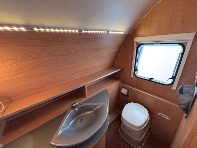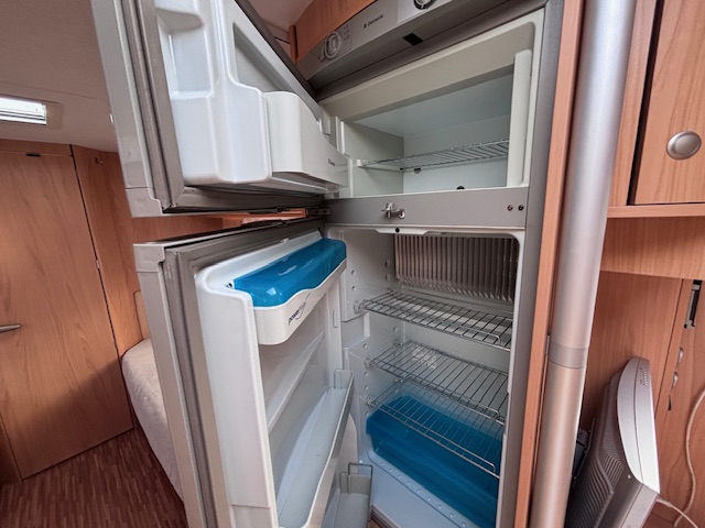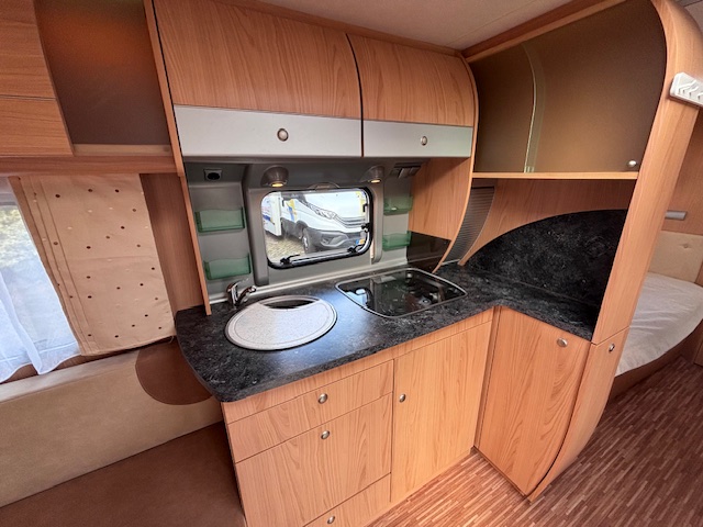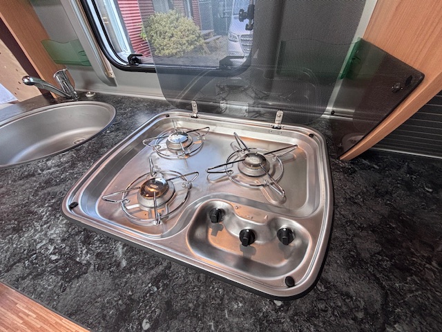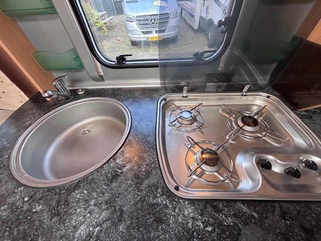 KEUKEN met 3-pits kookstel, SPOELBAK en DOMETIC KOELKAST met APARTE VRIESVAK
