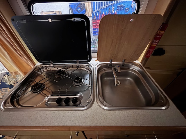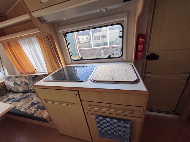 KEUKEN met 3-pits kookstel, spoelbak, KOELKAST