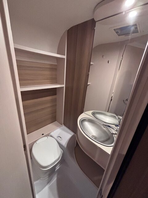 TOILETRUIMTE met THETFORD CASSETTE TOILET, WASBAK en DOUCHEBAK